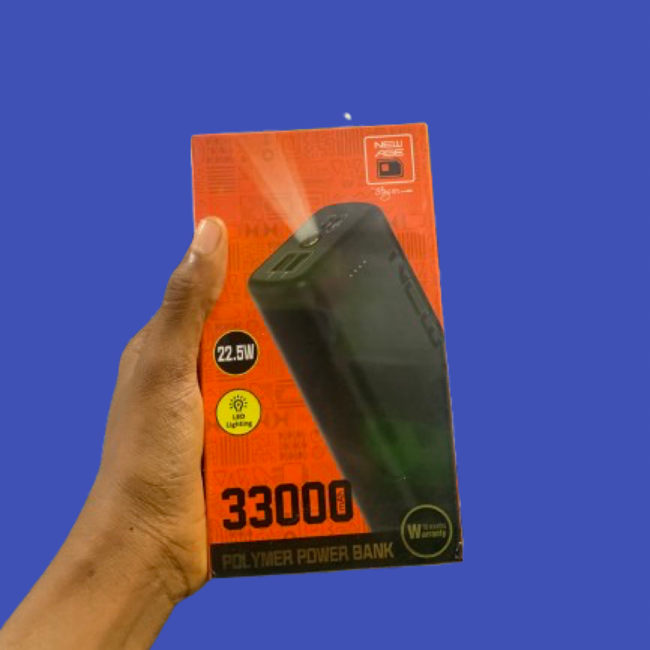 A 33,000mAh New Age power bank is a large-capacity portable charger designed for extended use, especially for users who need to charge multiple devices over a longer period. Here’s what to expect from such a power bank:
